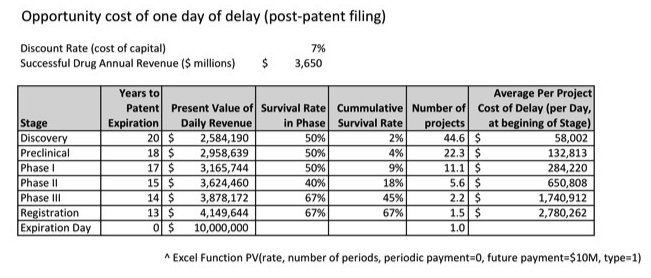 For the Pharmaceutical industry, the foregone revenue created by delays in bringing a drug to market can be surprisingly high — from $50,000 to $2,000,000 per day, depending on the phase of the pipeline. Such costs are often under appreciated.
