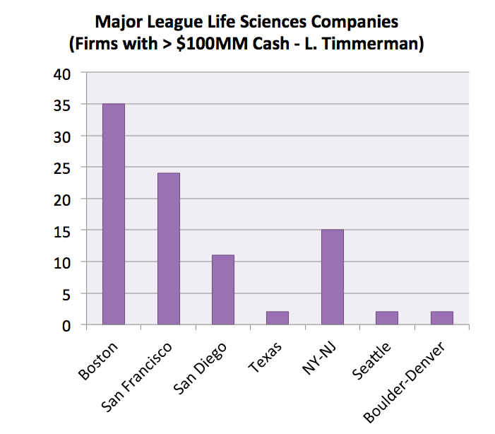Luke Timmerman from Xconomy has published an analysis of where the major Life Sciences companies are located. Using the criteria of having $100 million in cash and short term assets as the definition of a major firm, his analysis highlights what many observers have been noticing anecdotally — the Boston-Cambridge cluster is hands down the largest and fastest growing innovative Life Sciences hub in the U.S. (and thus the world). From 2003 to 2013, the number of major Life Sciences firms headquartered in Boston grew to 35, an astonishing growth rate of 192%. The next largest cluster, San Francisco, has 24 firms (growing 21% since 2003). And Boston’s count of companies doesn’t even include the major big pharmaceutical research centers that have sprung up in the last decade, but with corporate headquarters located elsewhere.