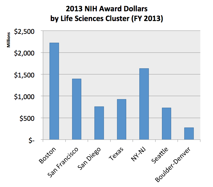 Boston-Cambridge received NIH funding of $2.2 billion in 2013, more than any other region of the country. On a per capita basis, Boston biomedical research stands out even more: