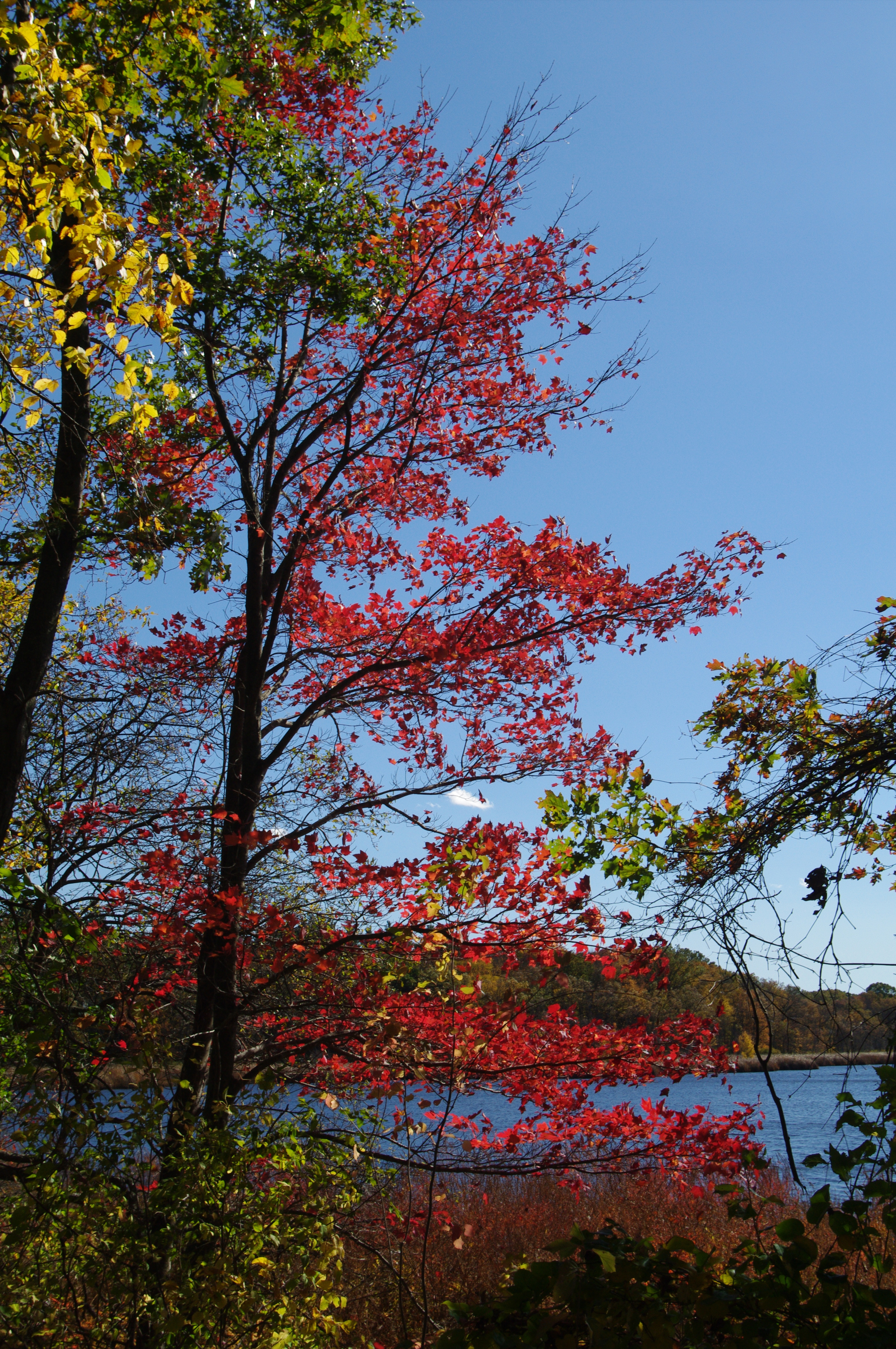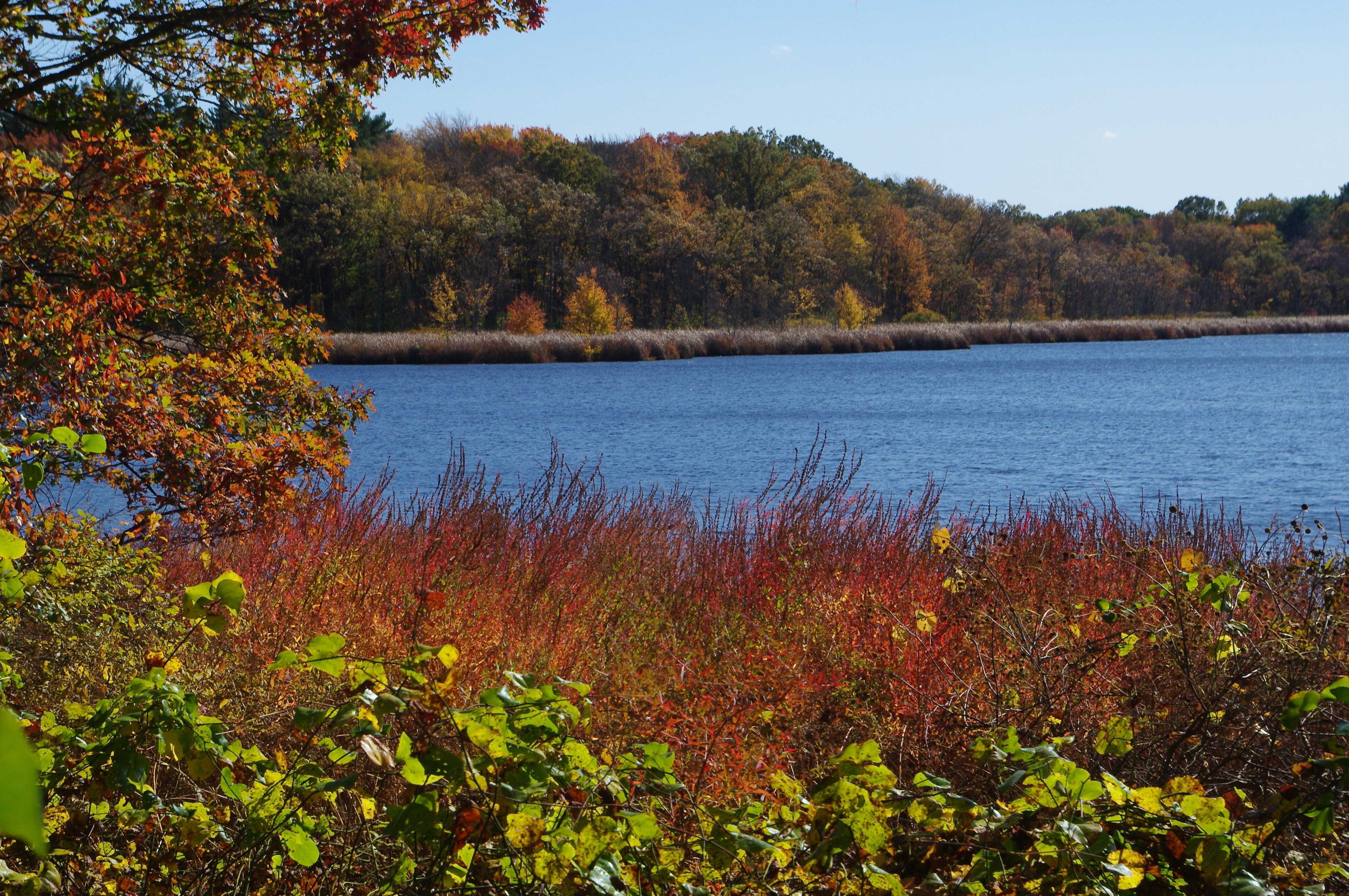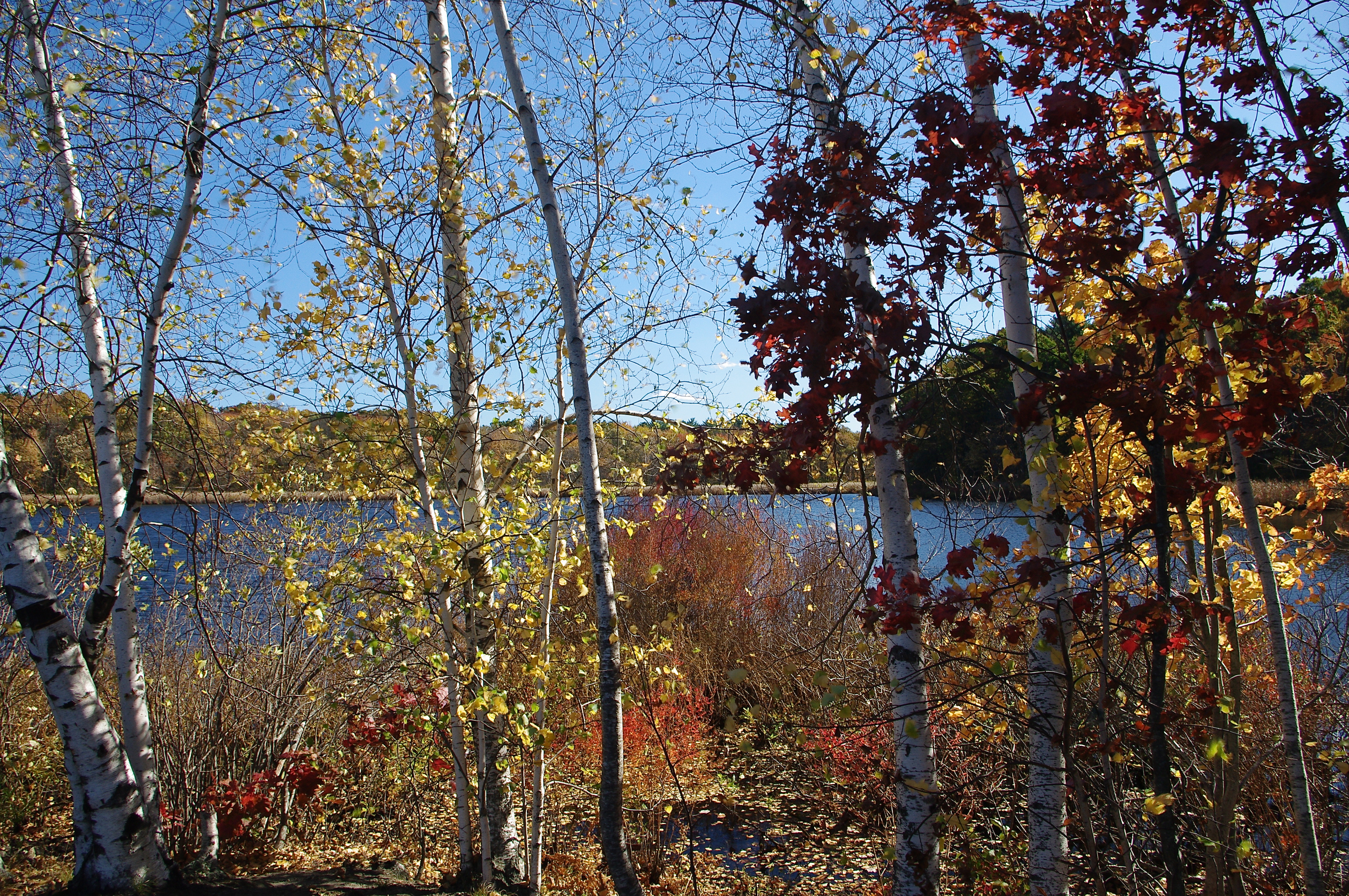 Along the shore of Kendrick Pond, on a crisp Fall day in Massachusetts.