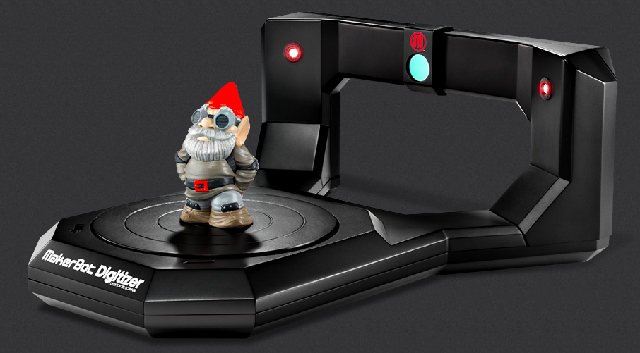 MakerBot‘s newest 3-D printer, the Makerbot Replictor Mini, started shipping yesterday. Employing fast and easy “One Touch” 3D printing, the Mini is a cost-effective solution for small scale prototyping or teaching kids about creating and printing in three dimensions. Makerbot also sells a small 3-D digitizer (seen below). Together you can capture 3D models, edit and manipulate them on a computer, and print them using PLA plastic. Total price tag is about $2,200 for both devices ($1375 for the Mini alone). Not exactly pocket change, but I predict that quite a few schools buy these as teaching tools.