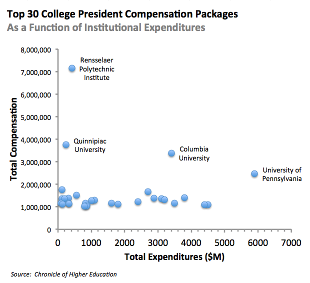 According to The Chronicle’s data, four extremely well compensated presidents stand out as dramatic outliers: Shirley Jackson (RPI), $7.1M; John Lahey (Quinnipiac), $3.8M; Lee Bollinger (Columbia), $3.4M; and Amy Gutmann (Penn), $2.5M. For Bollinger, Gutman, and perhaps Lahey one can make some argument for their high level of compensation, but Shirley Jackson at RPI is (almost literally) off the chart.