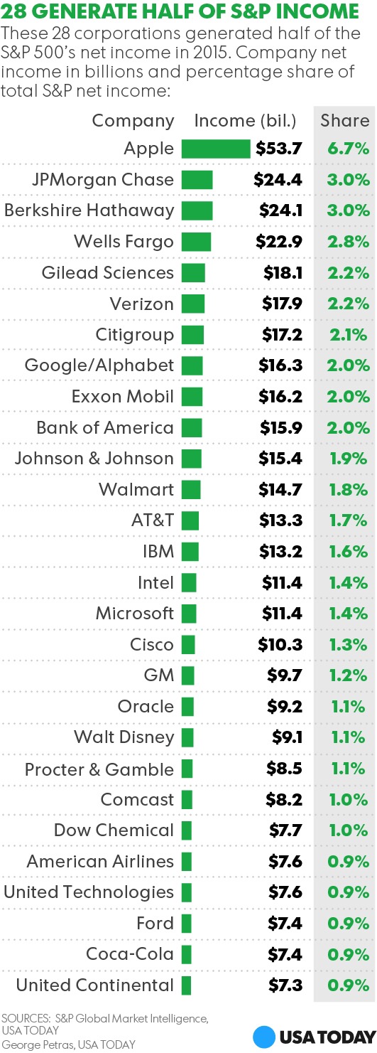 From an analysis done by USA Today: Just 28 companies in the S&P 500 index generate 50% of all the net income. Of those, Apple and JPMorgan Chase together make 10% of the profits. Berkshire Hathaway, Wells Fargo, Gilead Sciences and Verizon round out another 10%. That’s one fifth of total profits from only six companies.